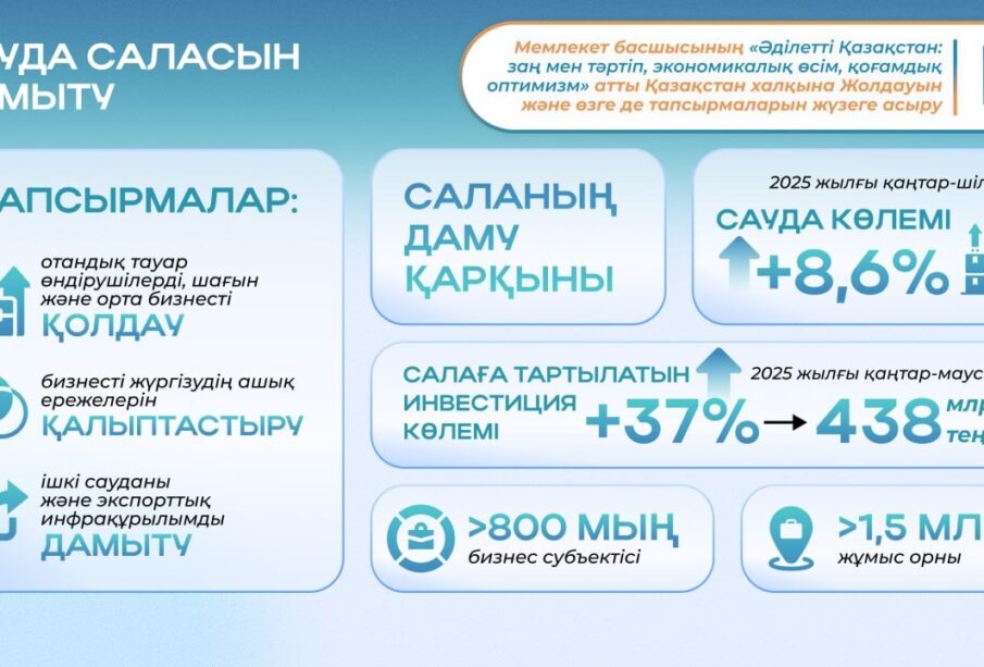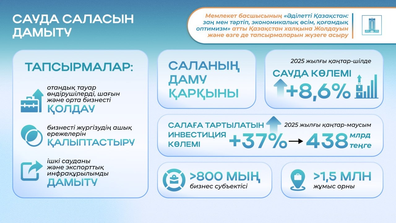 2025 жылғы қаңтар–шілде айларында сауда көлемі 8,6%-ға, ал салаға салынған инвестиция көлемі І жартыжылдықта 37%-ға өсіп, 438 млрд теңгеге жетті.