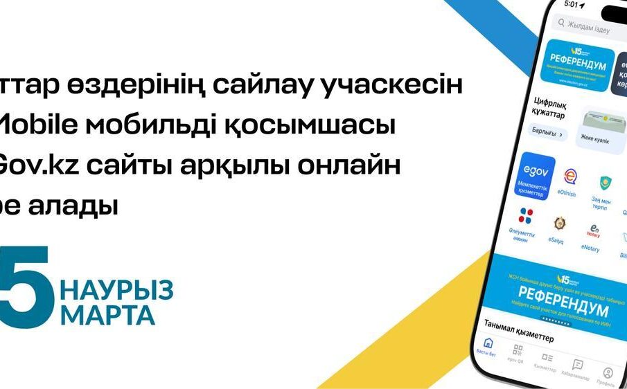 15 наурызда өтетін республикалық референдум қарсаңында азаматтар үшін өз сайлау учаскесін іздеуге арналған цифрлық сервис қолжетімді. Дауыс беретін қажетті пунктті eGov Mobile мобильді қосымшасы мен GOV.KZ порталында бірнеше қадамды орындап табуға болады.