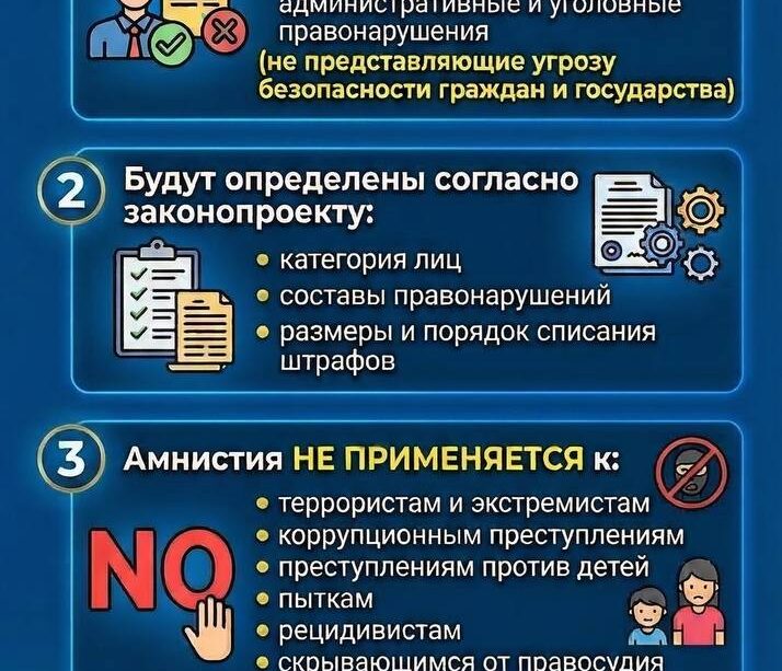 Қазіргі уақытта Ішкі істер министрлігі Әділет министрлігімен бірлесіп, амнистияны жүзеге асыру тетіктерін әзірлеуде. Құқық бұзушылық түрлері, амнистия қолданылатын тұлғалар санаты, айыппұлдарды есептен шығару көлемі мен тәртібі тиісті заң жобасын әзірлеу барысында нақтыланады.